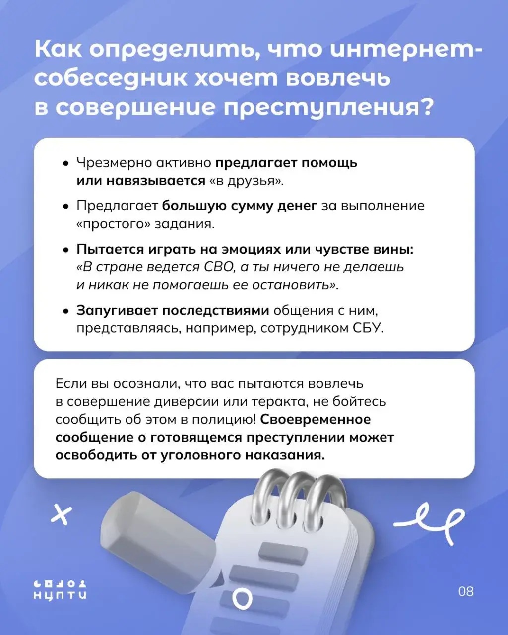 Как не стать жертвой вербовщиков и что грозит за диверсии? Объясняем в карточках